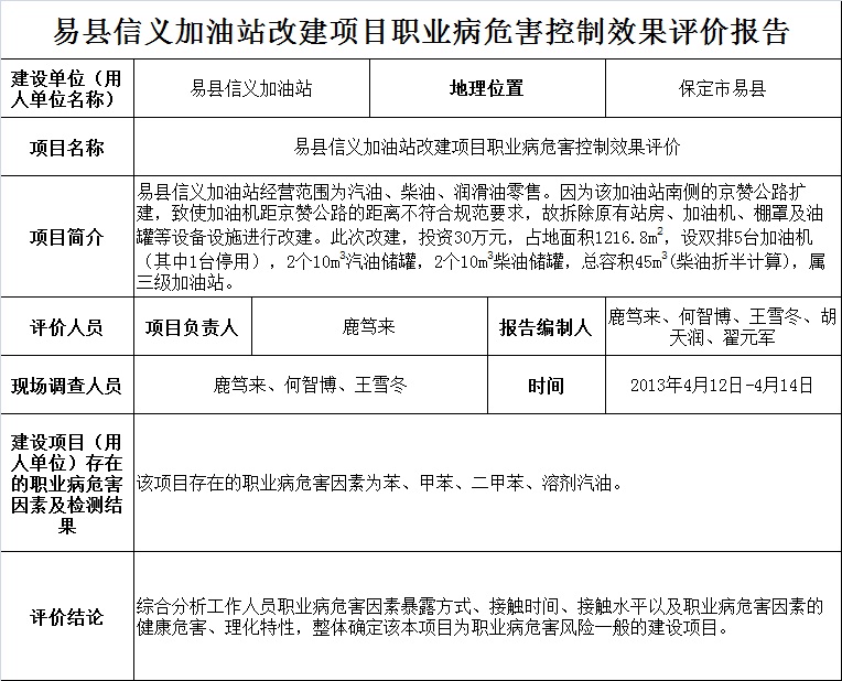 易县信义加油站改建项目职业病危害控制效果评价