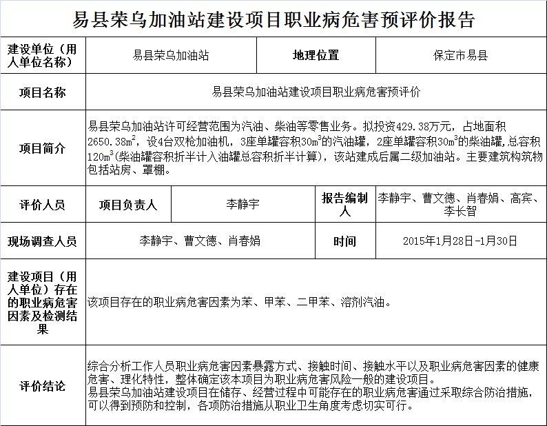 易县荣乌加油站建设项目职业病危害预评价