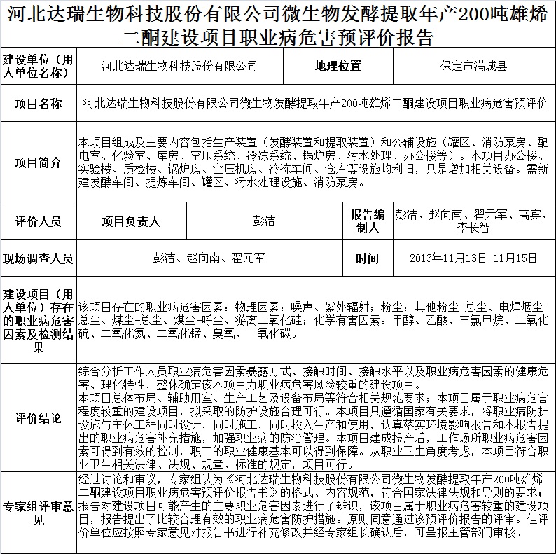 河北达瑞生物科技股份有限公司微生物发酵提取年产200吨雄烯二酮建设项目职业病危害预评价